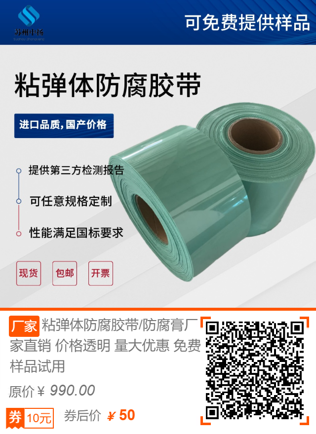 4.粘弹体防腐胶带可以使用10公分或15公分为宜。手动缠绕粘弹体胶带时,胶带应该有一定的变形能力,以保证搭接处不出现褶皱。